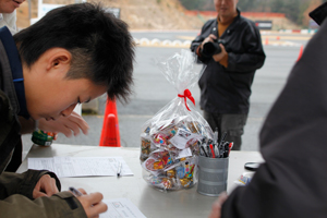 正解発表は、走行終了してから! みなさん、ドキドキです 今年は 一番近い重さを予想された方 誤差が9.1gと!!素晴らしい!! 2 位〜10位も次々と発表しました〜♪ |