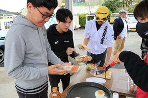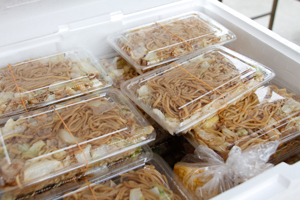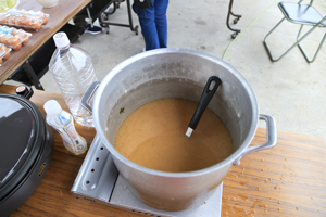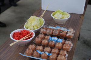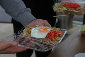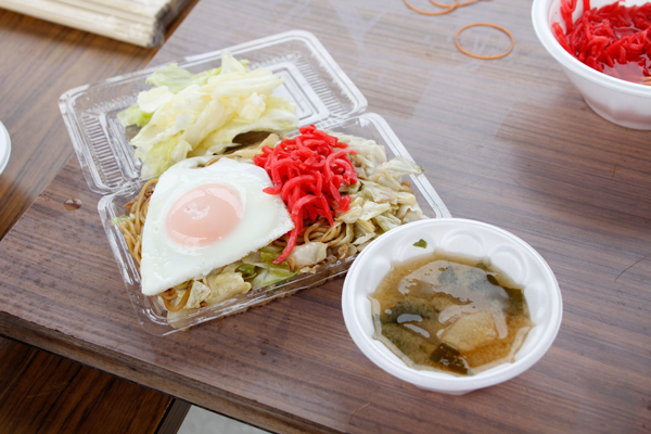 今年はタマダ食堂の西川さん作の やきそば!! お手製の冬瓜入り味噌汁や 1日目の懇親会で余った野菜で キャベツの浅漬けも! 味噌汁はご自由に〜なスタイルで提供! もちろんトッピングは 目玉焼き? |