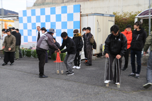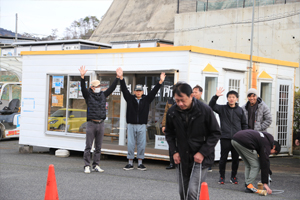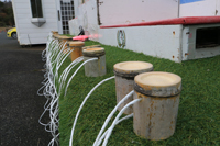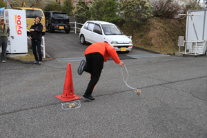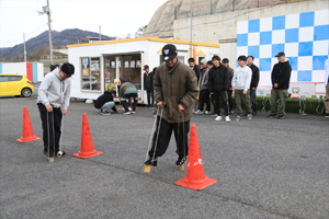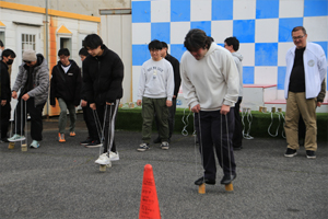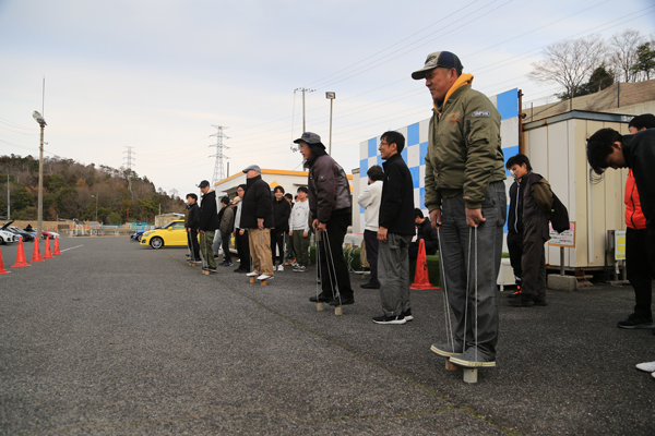 | 5人1組のチーム戦(リレー形式)で 今年は竹ポックリで潰れる心配もないので パイロンでUターンしてもらうことにしました! 潰れないから 試し歩きもできちゃいます! ということで、 みなさん『竹ポックリ』に乗って スタート待ち! めっちゃ安定感あって 『竹』ってすご〜〜い !!! |