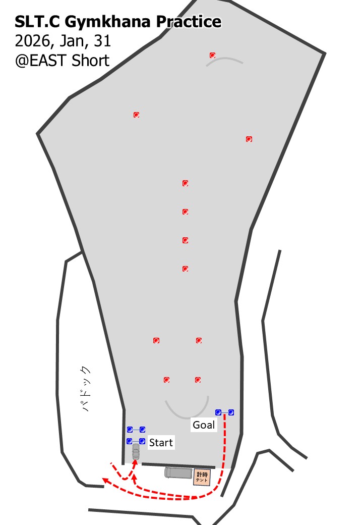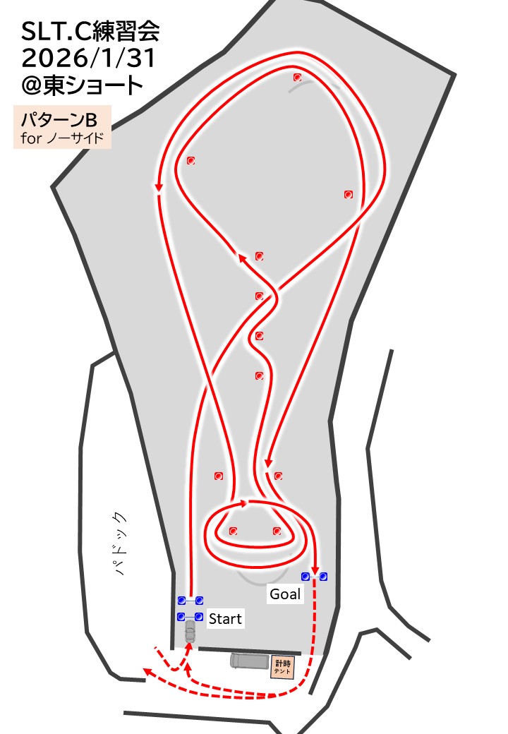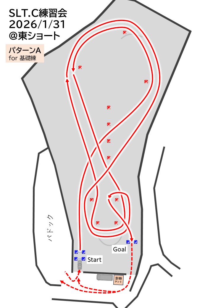 | 1月31日土曜日 東ショートコース ジムカーナフリー走行 SLT.C練習会 SLT.C練習会用に設定したコース図です。一般フリー走行の皆様は下記パイロン配置を参考までにご確認ください。 コース図 (ベース) コース図A コース図B コース図3 |